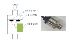 압력(p)이 인가되면 다이어프램이 변형을 일으키고, 이 변형은 스트레인 게이지에 의해서 저항 변화로 변환되어, 결국 전기신호로 출력